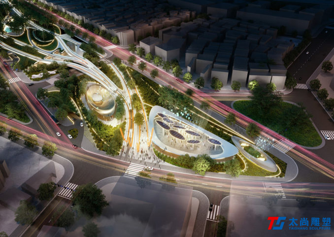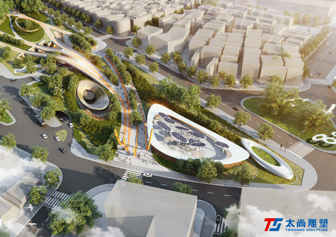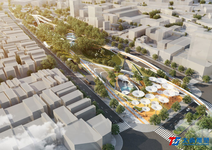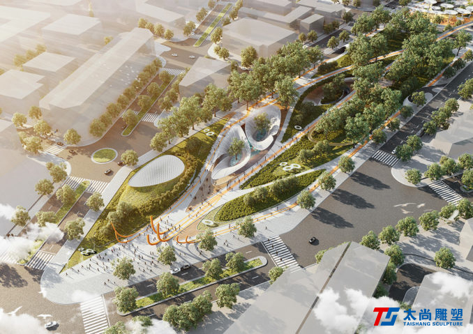 太尚雕塑的設(shè)計(jì)解釋是一個(gè)關(guān)鍵的設(shè)計(jì)元素。主要的步行和活動(dòng)網(wǎng)絡(luò)通過沿著場(chǎng)地前鐵路曲線的人行道被輕輕抬高,提醒游客其過去的城市結(jié)構(gòu)。它們勾勒出主動(dòng)和被動(dòng)空間的混合,使我們能夠創(chuàng)建一個(gè)高度連接和可滲透的公園空間,同時(shí)最大限度地保留并最大限度地減少對(duì)場(chǎng)地現(xiàn)有成熟樹木的影響。人行道的末端是一個(gè)戲劇性的扭曲鋼雕塑,進(jìn)一步紀(jì)念了基礎(chǔ)設(shè)施的歷史。